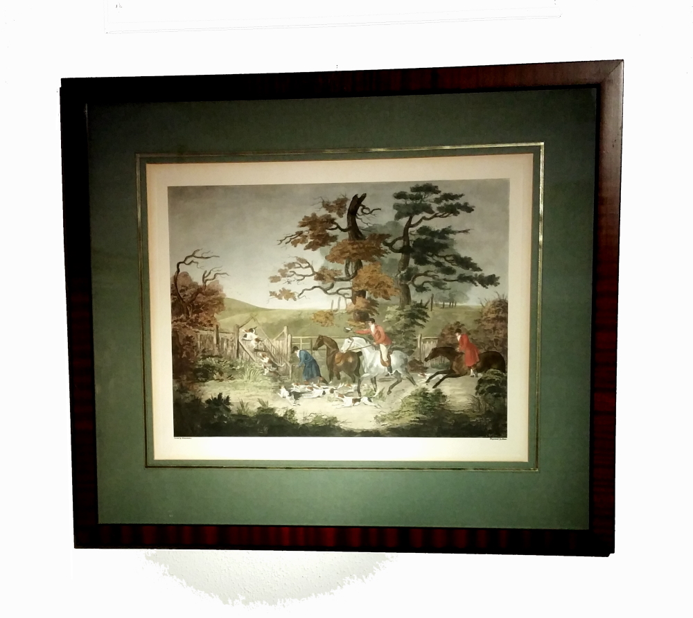 Englische Fuchsjagd, Kupferstich, Koloriete Lithographie, Gemalt von Dean Wolstenholme Sr. Graviert von Robert Reeve im Jahr 1806, herausgeben von Robert Reeve. Dean Wolstenholm (1757-1837 ) war ein englischer Tiermaler. In einem sehr guten Zustand, Holzrahmen, Mahagoni furniert.
