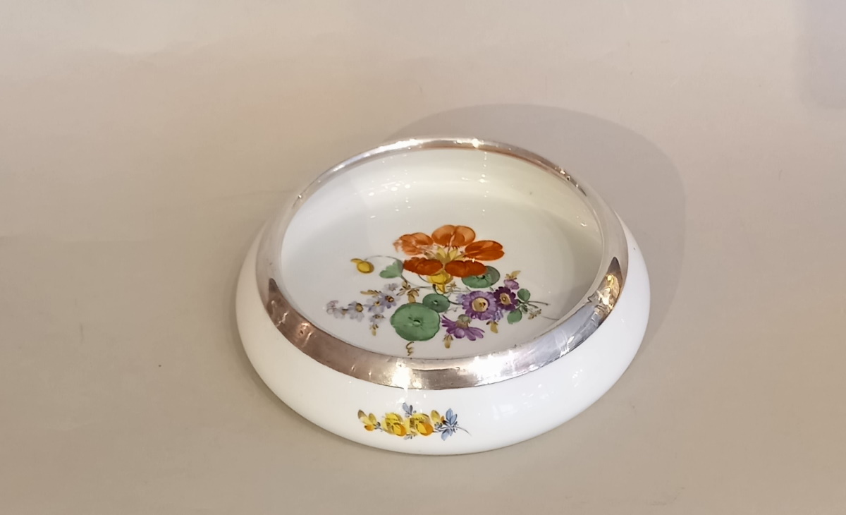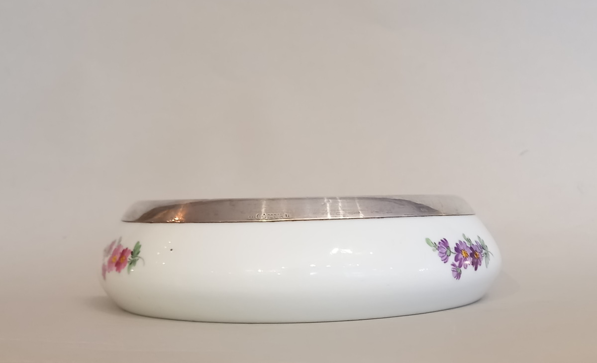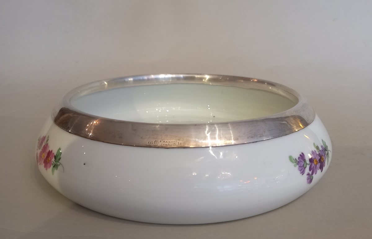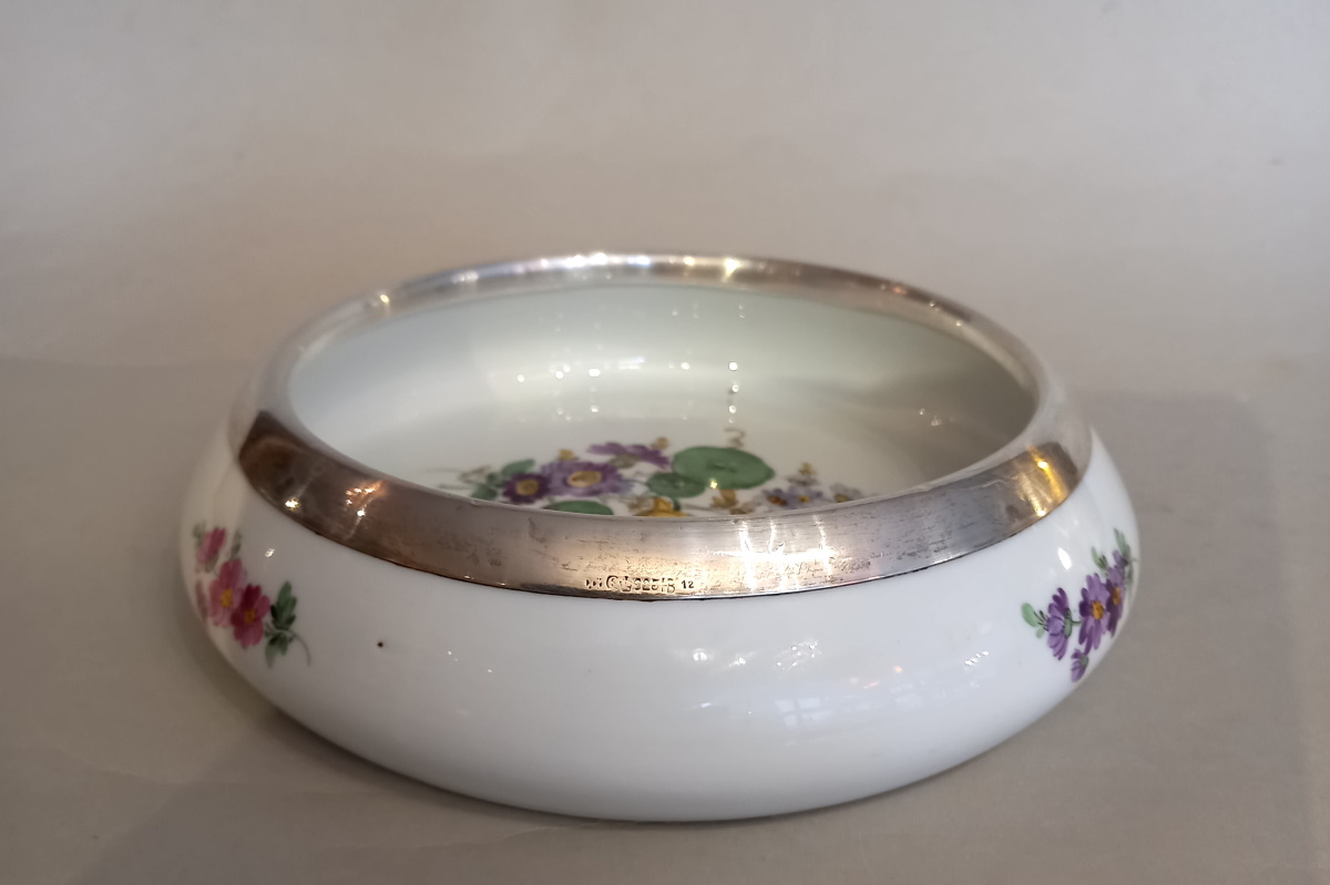 Meissener Porzellan Schale Hand bemalte Blumenmalerei und 925er Silbermontur,