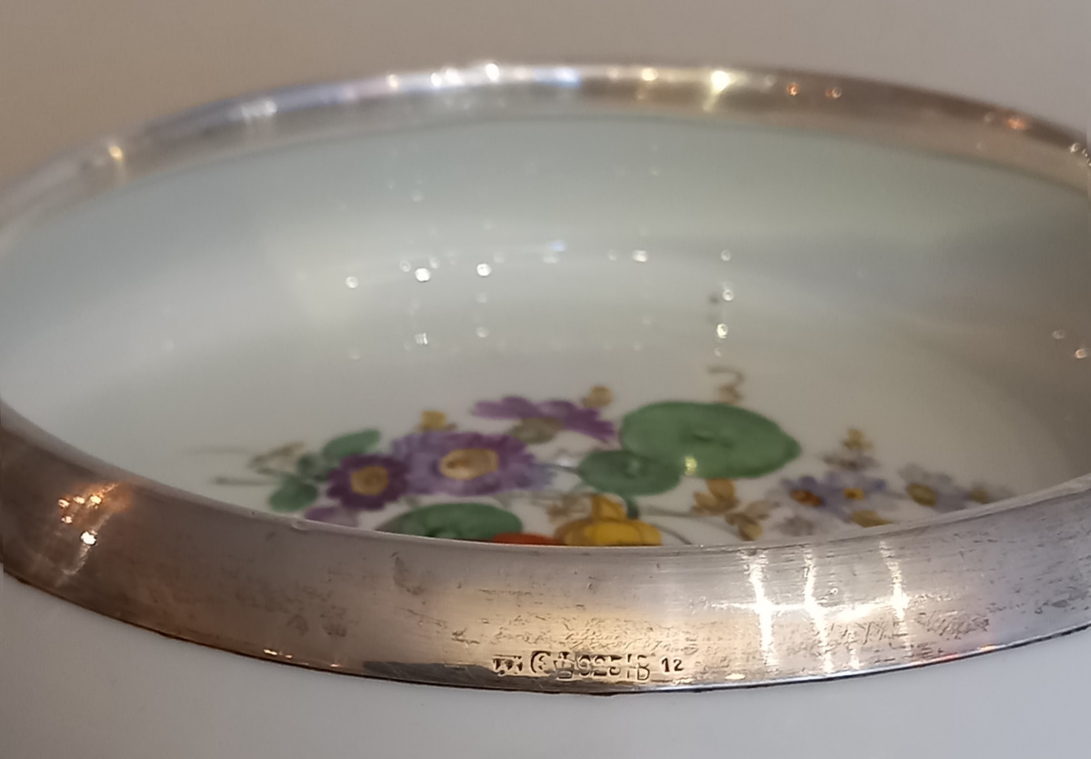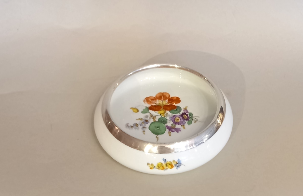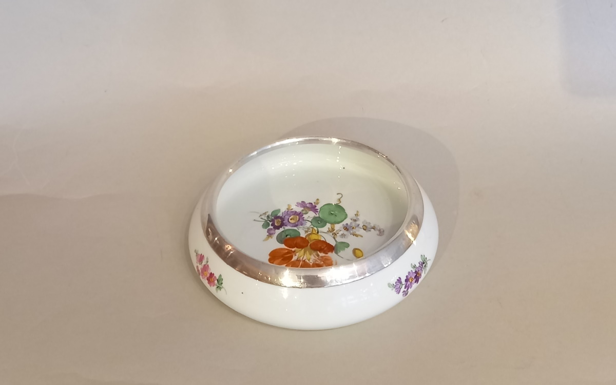 Meissener Porzellan Schale Hand bemalte Blumenmalerei und 925er Silbermontur,